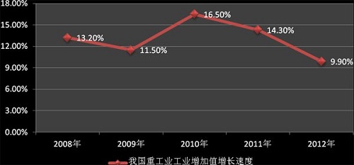 受到國際經(jīng)濟環(huán)境變動的影響,我國重工業(yè)在迎來高速發(fā)展期之后,其行業(yè)增速于2012年初開始有所放緩,呈現(xiàn)增長下滑的態(tài)勢,其主要的冶金礦山機械行業(yè)、物料搬運設(shè)備行業(yè)、礦山機械行業(yè)等增長情況亦受到影響。