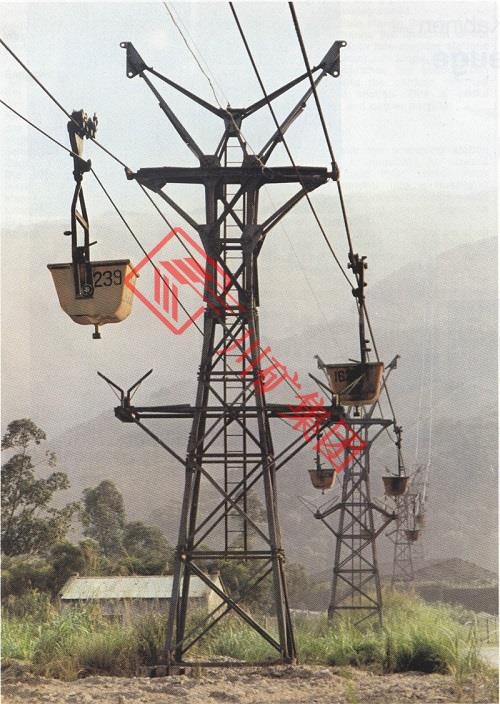 2、復(fù)線(支索、曳索各一)循環(huán)式貨運(yùn)索道系統(tǒng):線上有一個(gè)支撐吊桶,另一曳索拖曳吊桶以高速在線上行駛至站臺時(shí)脫索,再以低速進(jìn)行裝卸載作業(yè)。